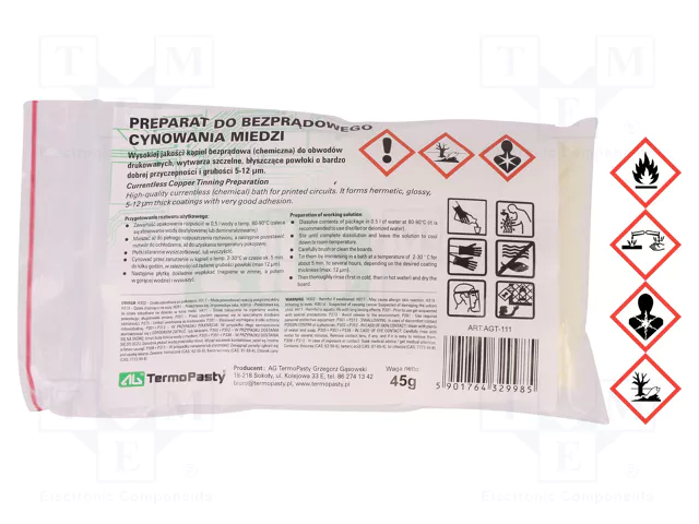 Χημική σκόνη επεξεργασίας χαλκού Termopasty AGT-111 για αποχαλκωση και κασσιτέρωση PCB και χάλκινων επιφανειών. Χρησιμοποιείται σε διαδικασίες παραγωγής και επισκευής πλακετών για προστασία του χαλκού και βελτίωση της συγκολλησιμότητας.