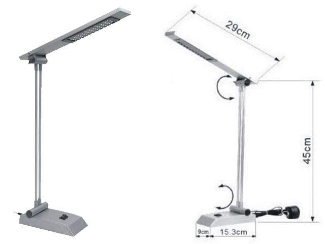 Επιτραπέζιο φωτιστικό γραφείου με 40 LEDs υψηλής φωτεινότητας, 2W, 180 Lumens, 6400K. Διακόπτης λειτουργίας. Τροφοδοτείται και από θύρα USB περιλαμβάνει τροφοδοτικό με έξοδο USB. Διαστάσεις: 29 x 45 x 9 cm.