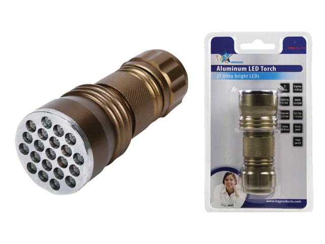 Φακός αλουμινίου με 21 LED και περίβλημα αλουμινίου. Τα Led εγγυούνται υψηλή φωτεινότητα, ενώ έχουν και μεγάλη διάρκεια ζωής (<50.000 ώρες). Το ισχυρό περίβλημα προστατεύει τον φακό από πτώσεις, ενώ ο διακόπτης ON/OFF προστατεύεται από καπάκι από καουτσούκ.