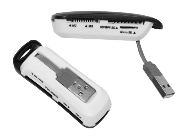 Συμπαγές card reader USB 2.0 με 4 υποδοχές. Συμβατό με τις κάρτες SD / MMC / RS-MMC / Mini SD / T-Flash / MS / MS PRO / MS DUO / MS PRO DUO / M2. Χωρίς χρήση adaptor για τις κάρτες Mini SD, T-Flash και M2.