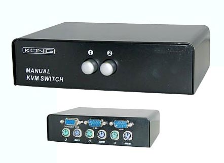 Διακόπτης για έλεγχο 2 υπολογιστών με ένα σέτ οθόνης - ποντικιού PS/2 - πληκτρολογίου PS/2. Είσοδοι: 1 HD15 θηλυκό, 2 PS/2 θηλυκά. Έξοδοι: 2 HD15 αρσενικά, 4 PS/2 θηλυκά.