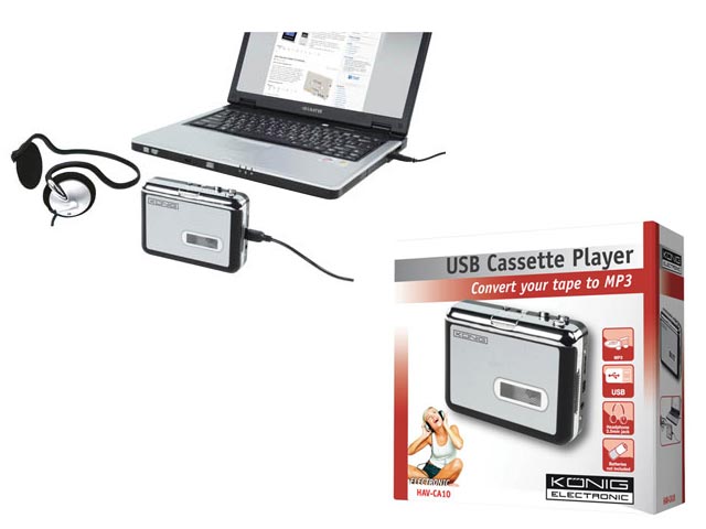 Μετατροπέας κασετών σε MP3. Έχετε ακόμη μια εκτεταμένη συλλογή από κασέτες; Με το MP3 converter μπορείτε να τις απολαύσετε πάλι. Όταν το συνδέσετε στον υπολογιστή σας θα μπορέσετε να μετατρέψετε τις κασέτες σας σε αρχεία MP3 απολαμβάνοντας τα οπουδήποτε και αν βρίσκεστε. Ο αντάπτορας λειτουργεί με μπαταρίες ή μπορεί να τροφοδοτηθεί μέσω USB.