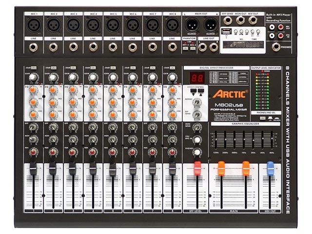 Λειτουργία αναπαραγωγής και εγγραφής από θύρα USB. 7 band graphic EQ, phantom 48V, DSP, 16 effects. Effect send, stereo tape input, stereo record output. Stereo output, mix main output, monitor output. Διαστάσεις: 46x36x10cm.