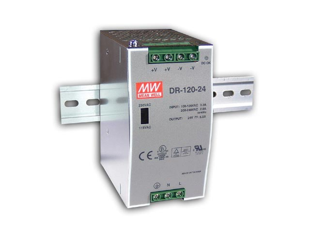 Switching τροφοδοτικό ράγας DIN, είσοδος 90-132 / 180-264V AC, έξοδος 24V/5A DC (120W), προστασία από βραχυκύκλωμα, υπερφόρτωση, υπέρταση, ψύξη με ελεύθερη μεταγωγή του αέρα, ρύθμιση τάσης εξόδου ±10%. Διαστάσεις: 65.5 x 125.2 x 100 mm. 3 χρόνια εγγύηση.