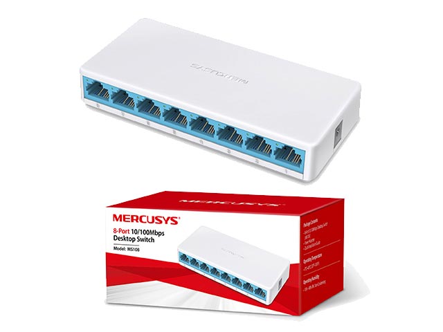 Το Mercusys MS105 είναι ένα switch σε διαστάσεις 127x60.3 mm. Διαθέτει 8 θύρες fast Ethernet που υποστηρίζουν τo αυτόματo MDI/MDIX patching. Η συσκευή είναι τύπου "plug and play", δεν απαιτεί αρχική ρύθμιση, λειτουργεί αμέσως μετά τη σύνδεση.