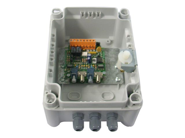 Συσκευή οπτικής ίνας εκπομπής/λήψης ( 1 rings ).Χρησιμοποιείται στα φωτοβολταικά πάρκα για την γεφύρωση με οπτική ίνα των Solar Panel. Το μοντέλο αυτό δίνεται με ειδικό κουτί στεγανότητας IP55.