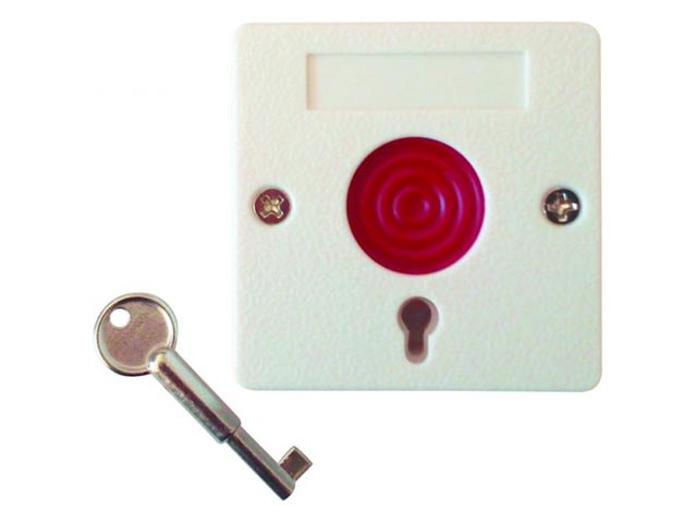 Χειρομπουτόν πανικού ληστείας με ένδειξη ενεργοποίησης και κλειδί επαναφοράς.