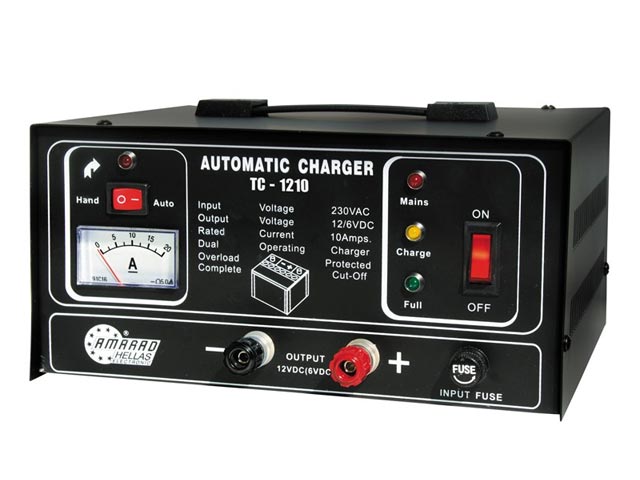 Φορτιστής μολύβδου 6-12V DC 10A, auto-manual. Κατάλληλος για φόρτιση μπαταριών τάσης 6V ή 12V και ρεύματος 10Α (10Ah). Ένδειξη του ρεύματος φόρτισης με αμπερόμετρο.. Φωτεινές ενδείξεις λειτουργιών. Λειτουργία αυτόματη και χειροκίνητη. Χειρολαβή μεταφοράς. Περιλαμβάνει καλώδια φόρτισης.