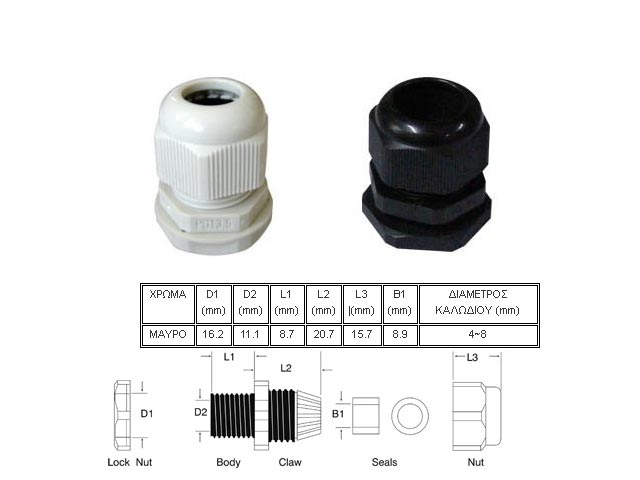 Στυπιοθλίπτης μαύρου ή γκρι χρώματος, nylon 66, 94V-2, IP68