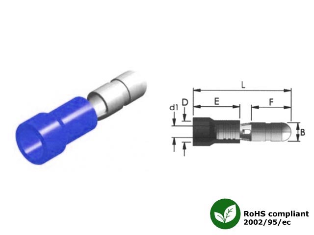 Ακροδέκτης κουμπωτός μπλε αρσενικός Β=4.0 F=8.5 L=21.0. Ελάχιστη ποσότητα παραγγελίας 100τμχ.