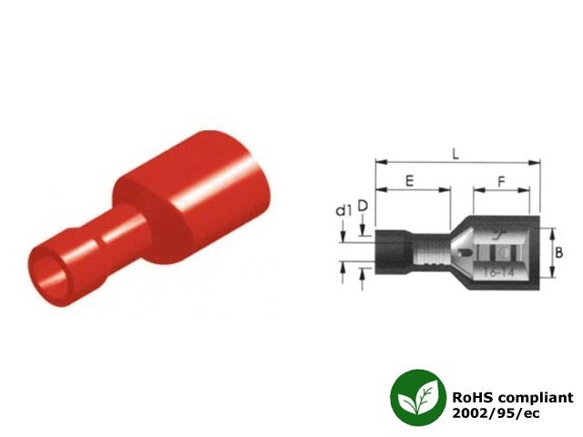 Ακροδέκτης συρταρωτός με πλήρη μόνωση, θηλυκός, κόκκινος B=6.6 F=7.9. Ελάχιστη ποσότητα παραγγελίας 100τμχ.