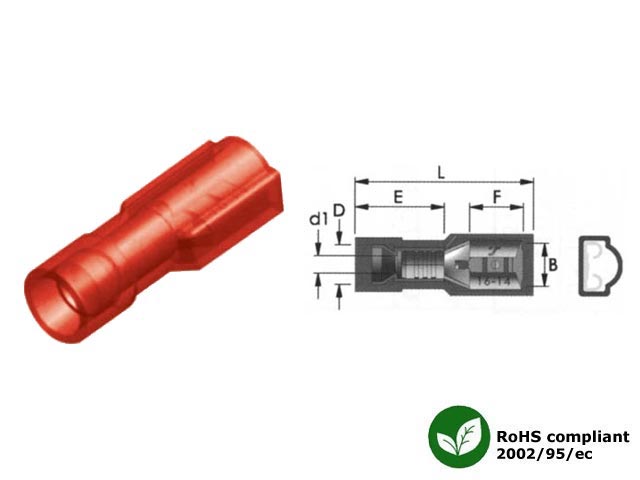 Ακροδέκτης συρταρωτός με πλήρη μόνωση, θηλυκός (Μ/Α) nylon, κόκκινος. B=5.0 F=6.4 L=20.5 E=10.5 D=4.2 d1=1.7. Ελάχιστη ποσότητα παραγγελίας 100τμχ.