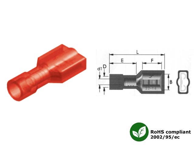 Ακροδέκτης συρταρωτός με πλήρη μόνωση, θηλυκός (Μ/Α) nylon, κόκκινος. B=6.6 F=7.9 L=22.0 E=10.5 D=4.0 d1=1.7. Ελάχιστη ποσότητα παραγγελίας 100τμχ.