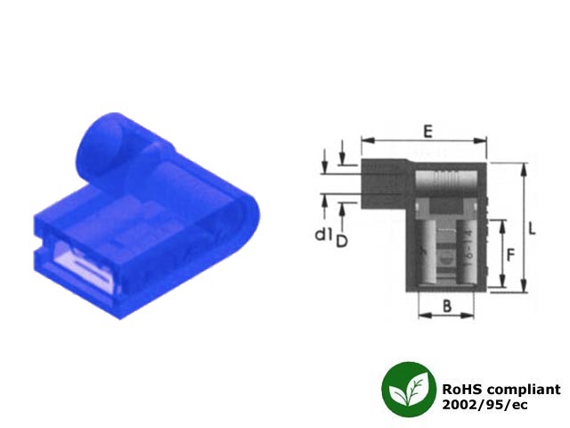 Ακροδέκτης συρταρωτός καλ/νος θηλυκός, γωνια, nylon, μπλε. B=6.6 F=7.9 L=16.1 E=15.0 D=4.5 d1=2.3. Ελάχιστη ποσότητα παραγγελίας 100τμχ.