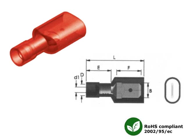 Ακροδέκτης συρταρωτός με πλήρη μόνωση, αρσενικός (Χ/Α) nylon, κόκκινος. B=6.4 F=7.9 L=23.5 E=10.5 D=4.2 d1=1.7. Ελάχιστη ποσότητα παραγγελίας 100τμχ.