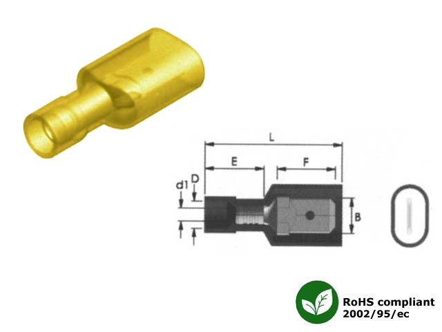 Ακροδέκτης συρταρωτός με πλήρη μόνωση, αρσενικός (Χ/Α) nylon, κίτρινος. B=6.4 F=7.9 L=27.0 E=13.0 D=6.5 d1=3.4. Ελάχιστη ποσότητα παραγγελίας 100τμχ.