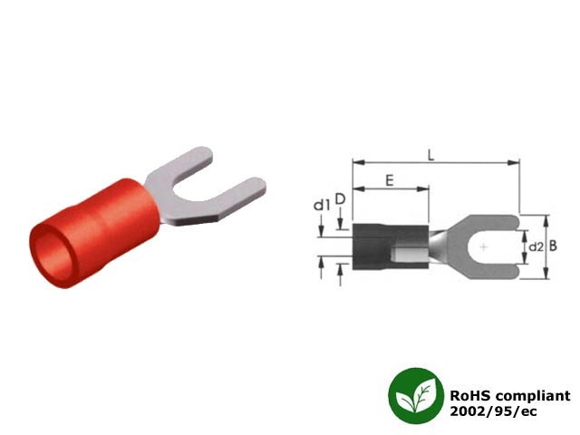 Ακροδέκτης δίχαλο κοκκινος Φ6.5 L=21.0 B=9.5 E=10. Ελάχιστη ποσότητα παραγγελίας 100τμχ.