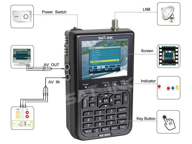 Πεδιόμετρο χειρός ιδανικό για την ρύθμιση και την ευθυγράμμιση δορυφορικού κατόπτρου. Χρησιμοποιώντας τις παραμέτρους του δορυφόρου, μπορείτε να θέσετε και να ευθυγραμμίσετε ένα δορυφορικό πιάτο γρήγορα, εύκολα και ακριβώς. Μερικά από τα χαρακτηριστικά του είναι τα εξής: A/V In - Out, Εικόνα στα κανάλια (ελεύθερα) Φάσμα 950MHz -2150MHz, Τροφοδοσία Lnb 13/18V 350mA. DiseqC 1.0, & 1.2, 2Mbps - 45Mbps. Color Display 3.5" TFT LCD, 1 x USB 2.0, Φορτιστής Μπαταρίας & Αυτοκινήτου, RCA Audio/Video output για σύνδεση με TV Μπαταρία Li-on 3000mA, Βάρος 0,5Kg.