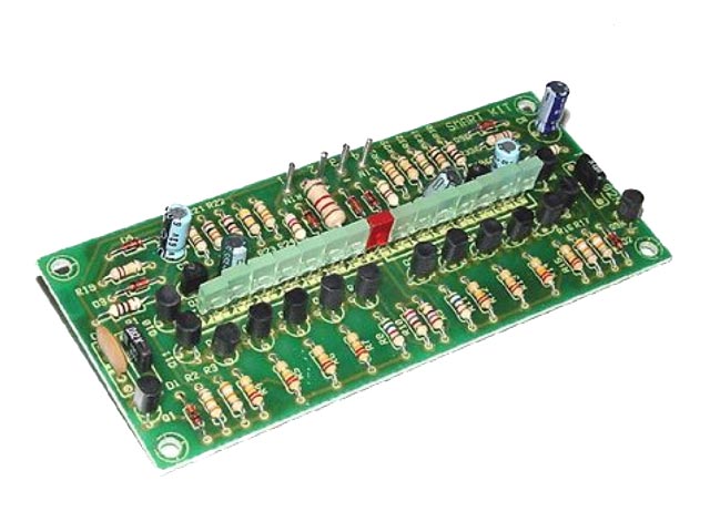 Another VU-METER from SMART KIT but this may be the most advanced and the best looking of all. It has been designed for STEREO amplifiers and uses 15 LEDs, placed in a straight line, 7 for each channel with the LED in the centre used as an ON indicator. The display is symmetrical, on either side of the central LED which is always on. It works with any amplifier from a few mW to 100 Watts. As it works with 12VDC it can also be used in the car.