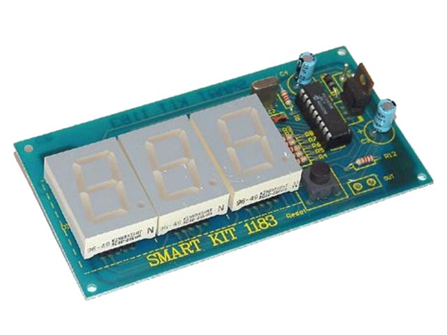 Ένα κύκλωμα ιδαίτερα χρήσιμο στην ακριβή μέτρηση "συμβάντων". Χρησιμοποιώντας το κατάλληλο αισθητήριο μπορούμε π.χ να μετρήσουμε: τον αριθμό των εισόδων και εξόδων ατόμων σε ένα κτήριο, τον αριθμό τεμαχίων που περνούν από μία μηχανή παραγωγής, κ.λ.π. Η καρδιά του κυκλώματος είναι ο μικροελεγκτής PIC 16C54 ο οποίος, κάθε φορά που διεγείρεται το αισθητήριο, αυξάνει κατά μία μονάδα ένα εσωτερικό καταχωρητή και οδηγεί τα τρία led displays τα οποία παρέχουν οπτική ένδειξη. Τάση τροφοδοσίας 9-12V DC. Κατάλληλο κιτ. 1061 Κατανάλωση: 100mA. PCB 62x142mm.