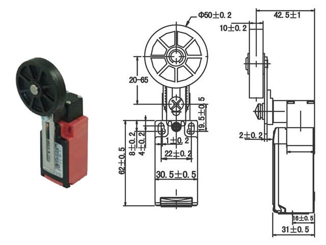 Διακόπτης τερματικός πλαστικός ροδάκι. Περιστρεφόμενος βραχίονας με ρύθμιση μήκους & ελαστικό ροδάκι Φ50. Χωρίς ρυθμιζόμενο άκρο. Διαστάσεις: 30.5x62x31mm. Προστασία: IΡ65.