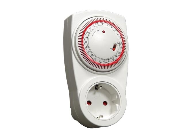 Ημερήσιος μηχανικός χρονοδιακόπτης πρίζας. Ελάχιστος χρόνος ρύθμισης ανά 15 λεπτά. Διακόπτης επιλογής λειτουργίας χρονοδιακόπτη ή μόνιμης λειτουργίας. Μέγιστη ισχύς 3.68kW.