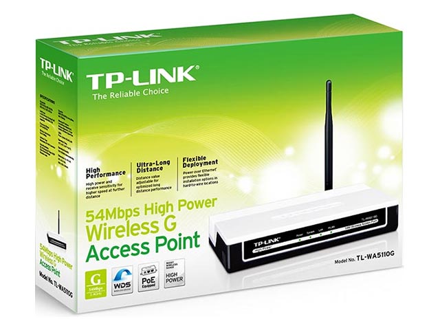 Το TL-WA5110G High Power Wireless Access Point είναι ενδεδειγμένο για χρήση στο γραφείο ή στο σπίτι και σε ασυρμάτα δίκτυα μεγάλων αποστάσεων. Ενσωματώνει τις λειτουργίες ενός ασύρματου Access Point, WISP client, firewall, και router.
