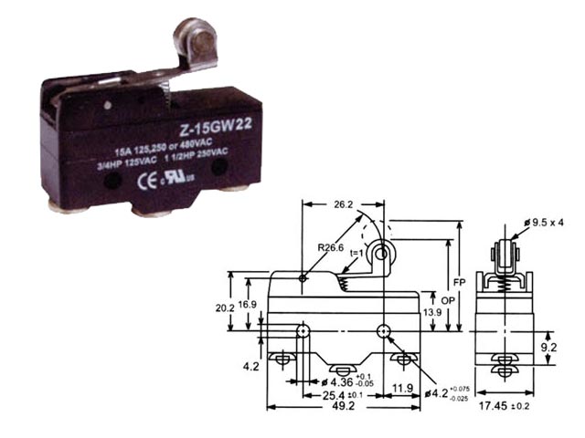 Τερματικός διακόπτης 15A 125/250V AC Suns. Με κοντό έλασμα, ελατήριο & ροδάκι. 15A/250V AC. IP63.